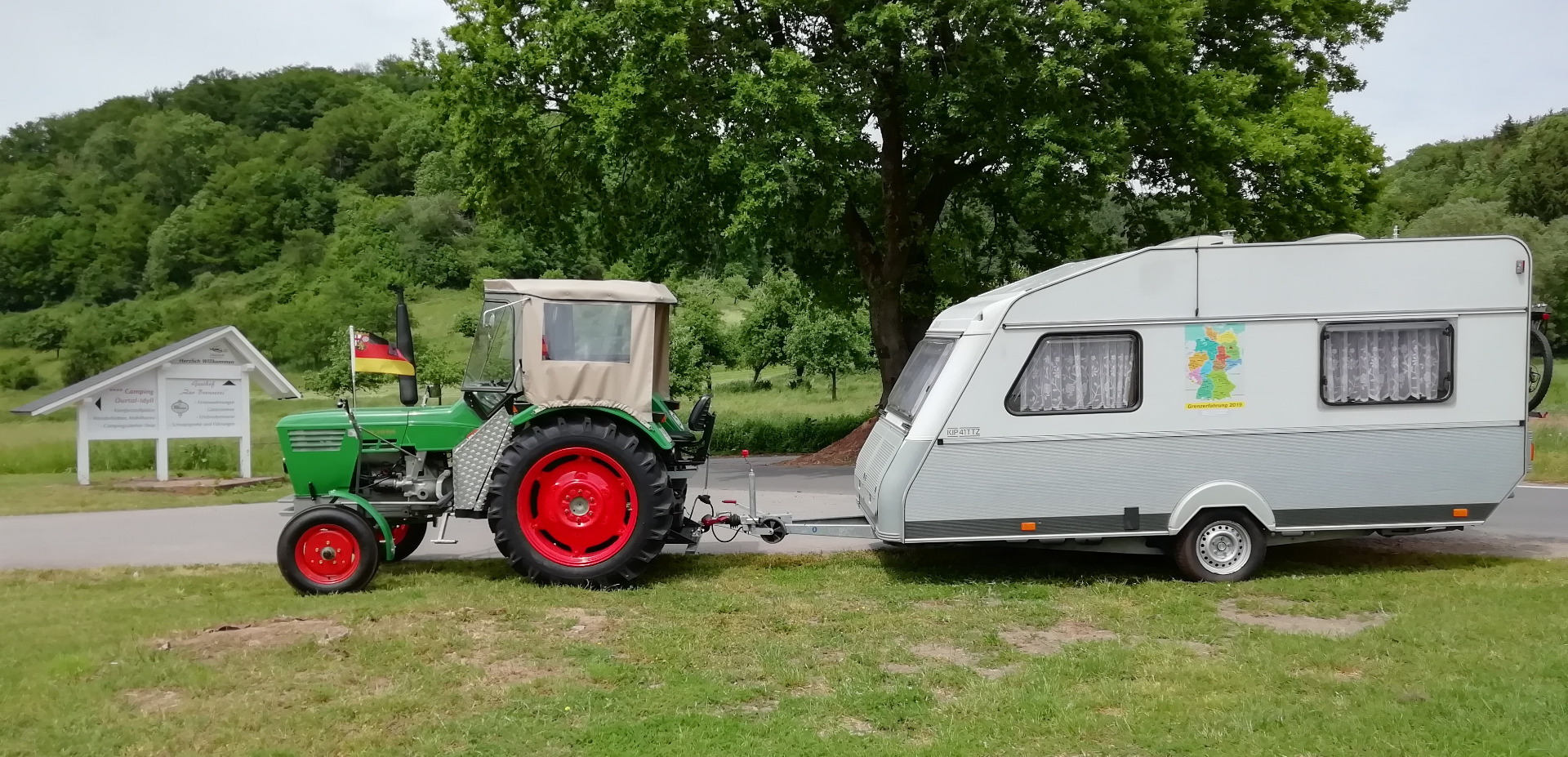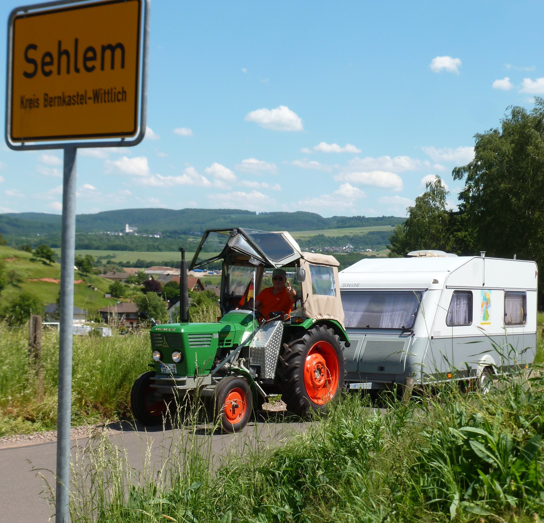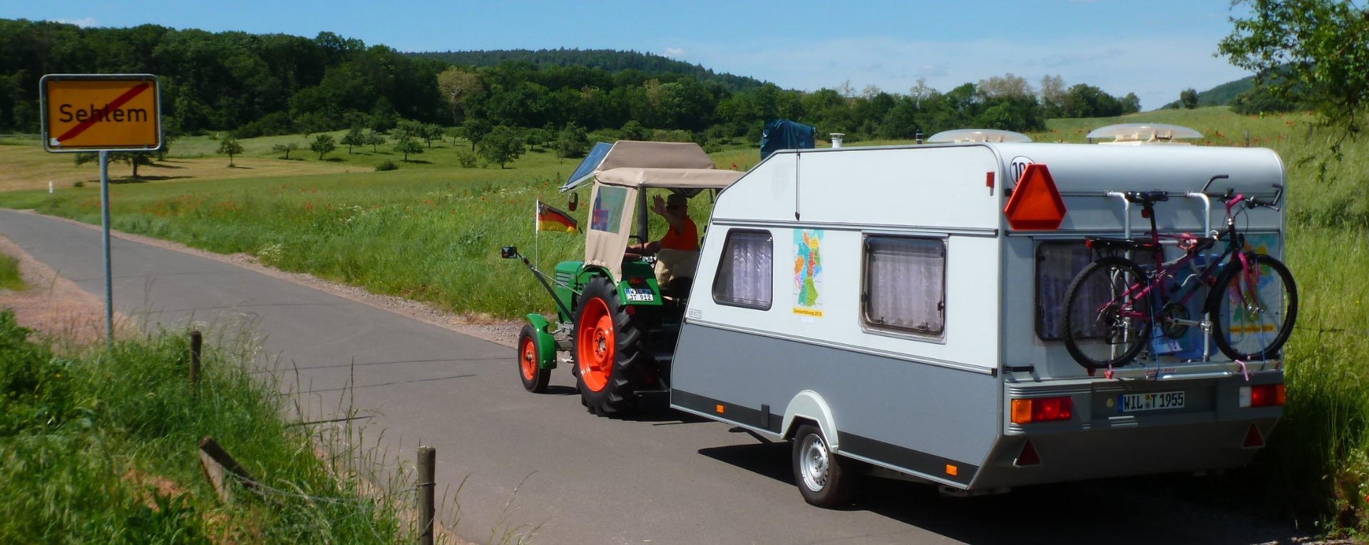 Heute Morgen hieß es Abschied nehmen von Zuhause für die nächsten ca. 3 Monate. Alles funktionierte soweit ganz gut, aber durch die Aufregung hatte ich vergessen, die Stromverbindung von der Steckdose zum Wohnwagen zu entfernen. Bei der Abfahrt bemerkte ich plötzlich meinen Nachbarn Walter neben dem Wohnwagen herlaufen mit einem Stromkabel in der Hand. War noch mal alles gut gegangen. Nachdem meine Frau Cilli noch bei der Ausfahrt aus dem Ort ein paar Fotos gemacht hatte, konnte ich Gas geben.